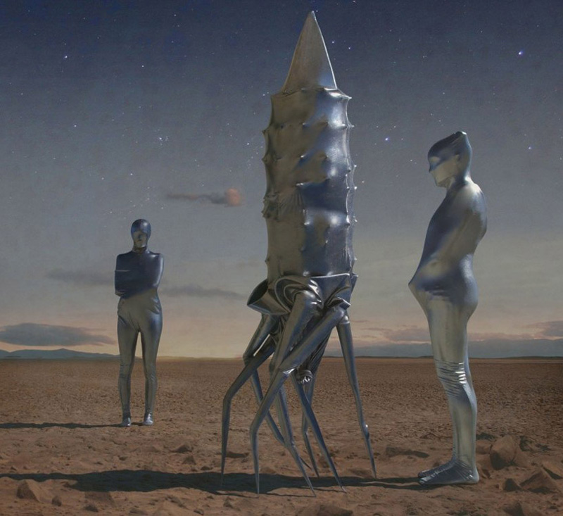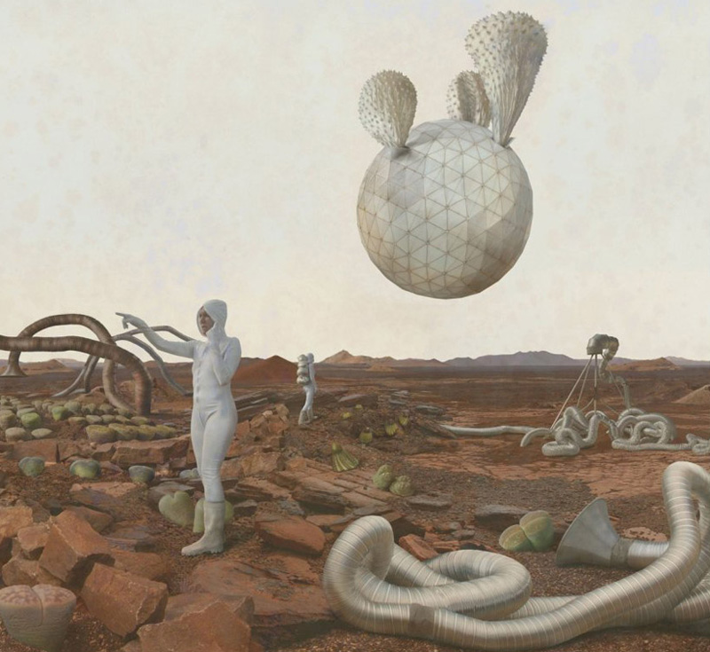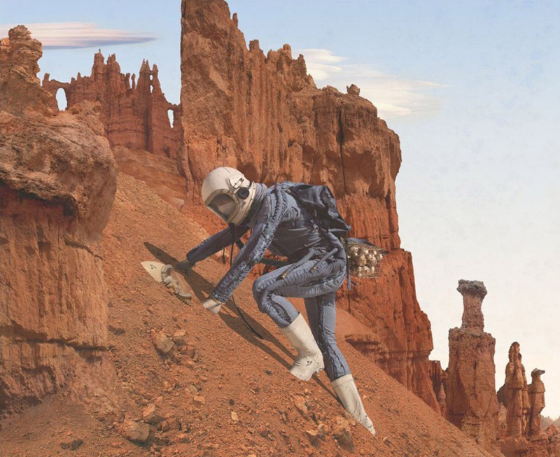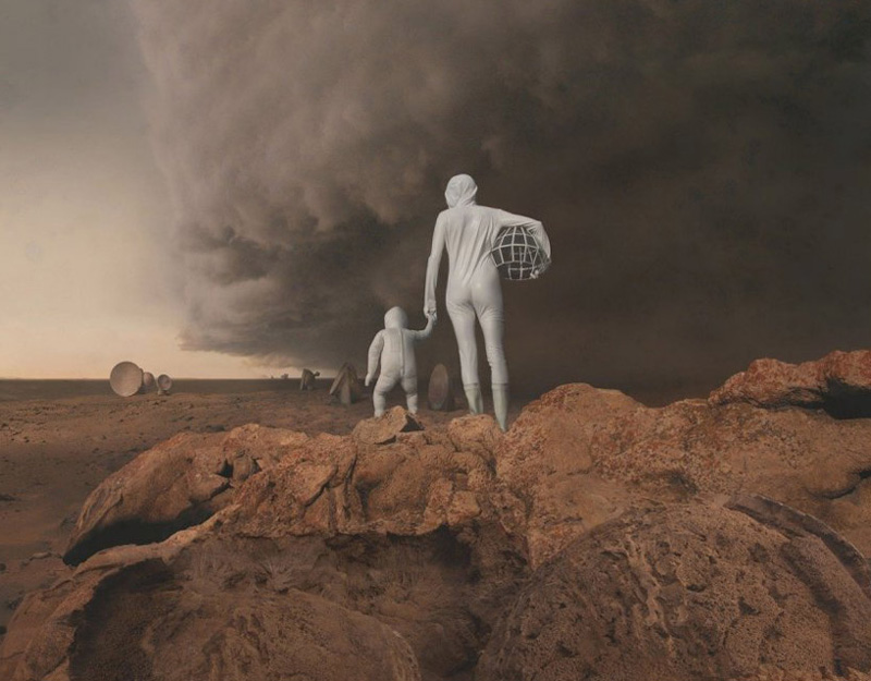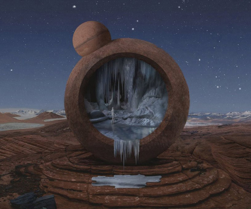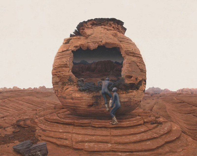 随着美国好奇号火星探测器成功着陆,NASA委托英裔美国艺术家,kahnselesnick创作一组题为“mars: adrift on the hourglass sea”的作品,来代表他们对火星生命的愿景。艺术家利用NASA提供的“勇气号”和“机遇号”拍摄的火星实景照片,再拼接上自己想象的图景,将亦真亦幻的视觉元素融入其中,创造了一个科幻的,超现实的情景。