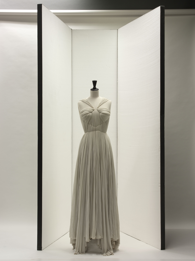 这些设计和手工精美绝伦的服装与一些经典的雕塑作品一同被放置在展厅内,以障显这位有些神秘的服装设计大师极简又典雅的创作风格。Madame Grès曾经说过:“我想成为一名雕塑家,对我而言和面料打交道与和石头是没什么差别的。”这种喜欢从古希腊雕塑、陶器和绘画中吸取设计灵感的方式,也正是从20s末期开始很多设计师都喜欢的,更早的前辈大师如Madeleine Vionnet是最早带起这股崇尚希腊美学的风潮的时尚先驱人,她创造了经典的露背装、修道士领式和打褶法,其独特的希腊式晚礼服,高腰裁剪,精致珠绣手工和褶皱裙摆,女神般的设计风格一度闻名于当时的欧洲社交界。