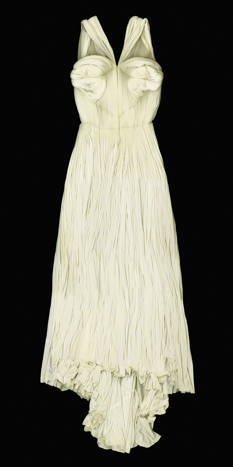 她将面料整匹披在模特身上,直接进行缝制,绵密的褶皱全用手工完成,过程就如同一位雕塑家纯熟控制石料的块面线条。曾说过“我想成为一名雕塑家,我把所有的布料都看做是石头,我要去精心地雕刻。”她早期的灵感缪斯之一,是首个在台上穿着希腊式衣裙赤足起舞的芭蕾舞女神邓肯。由此人们可窥见她对于服装美感的追求,她的斜肩礼服、雪纺纱褶皱裙都带着希腊式的唯美,起舞时薄如蝉翼的衣裙能让光线柔和地覆盖身体,静止时却像雕像一样拥有静如哲思的线条。