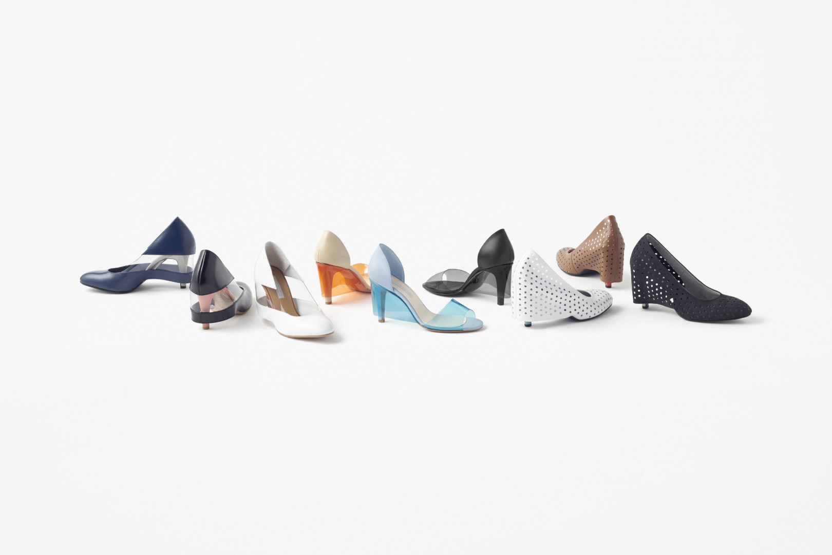 东京涩谷区以日本年青一代的聚集地而著称,作为对该地区一家小型鞋作坊进行支持的项目部分,Nendo专门为西武百货公司设计了一组精选女鞋系列。高跟单鞋和高跟凉鞋的鞋跟部分以相关材料外搭,就如同穿上了一件裙子。一共有三种基本设计:一双使用透明PVC材料的高跟凉鞋,使用点状打孔皮革材质的高跟单鞋,以及联合皮革和透明材料以制造出一种皮革间分离效果的高跟单鞋。