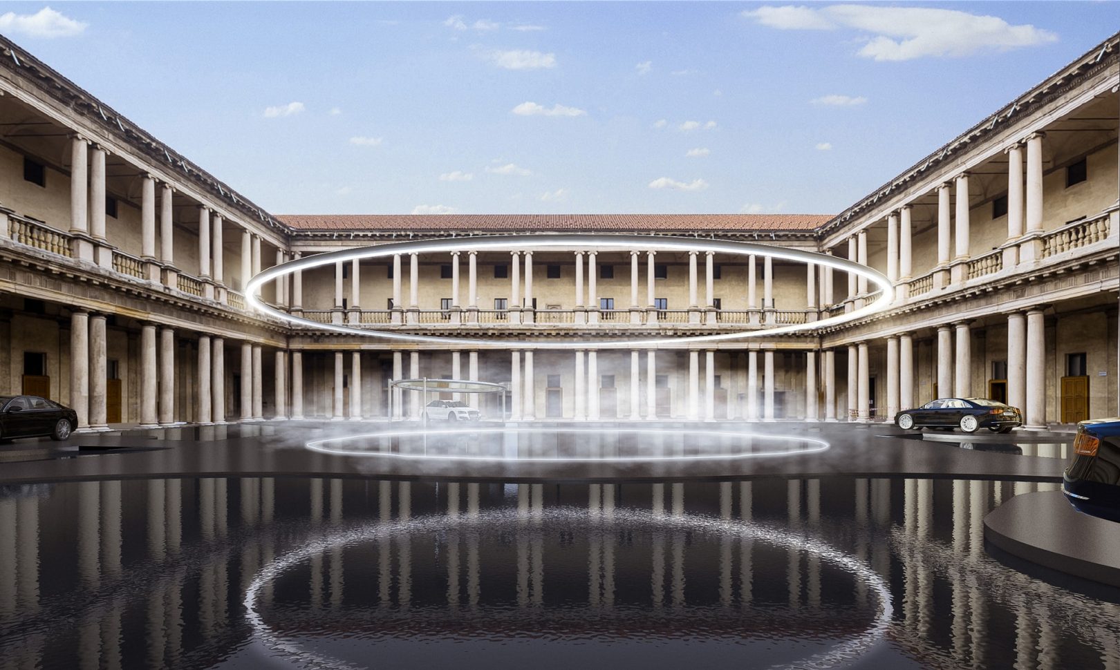 《Open Sky》是一个放置在地上的接触式的抽象反射装置,而将它放在16世纪宫殿庭院里,则表现出了在米兰美丽的天空下这座历史建筑展现出的新面貌。 当游客穿过柱廊时,能够感受到这座豪华宫殿扭曲的形状和新的形象,当你接近装置的中心时,能够看到天空中瞬息变化的云彩和色彩。